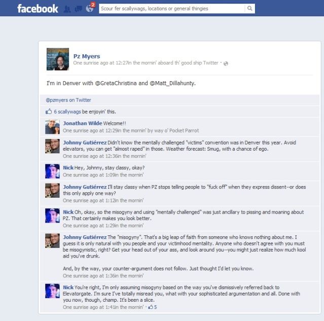 You know what really bugs the hell out of me about PZ? And this is not anything new, I'm sure most people that don't like him feel the same. But it's the way he is constantly telling people to "Fuck Off" or calls them names like "asshole" or whatever. Then you meet him face to face, he couldn't be ...