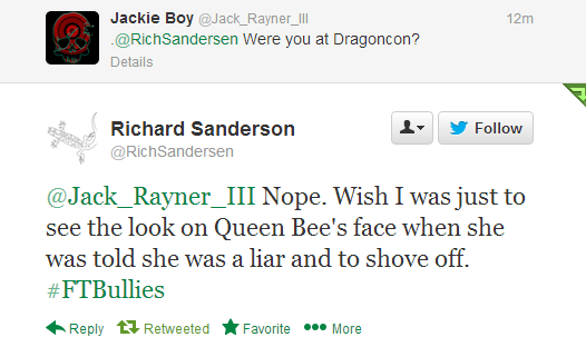 It's all skepticism's fault... https://twitter.com/SurlyAmy/status/374282083155202048 Isn't Dragoncon a sci-fi/fantasy con? I think she's implying that skeptics reported them...somehow. I'm sure the Slymepit will eventually be blamed. Even if it's just by proxy. Because Richard Sanderson is a Slyme...