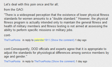 He was trying to say that his objection was to my anecdote about the females falling out of the 10 mile, 80lbs in our back packs hike. I pointed out that I brought this up in agreeance to his statement about there being more females who fail at these tasks. So he said that no, I said this before his "GAO" statement, so I went and took a screen cap showing my reply following his "GAO" statement, and by the time I returned to reply, the relevant comments, and then some, were gone.