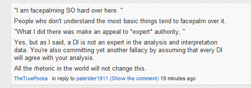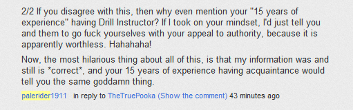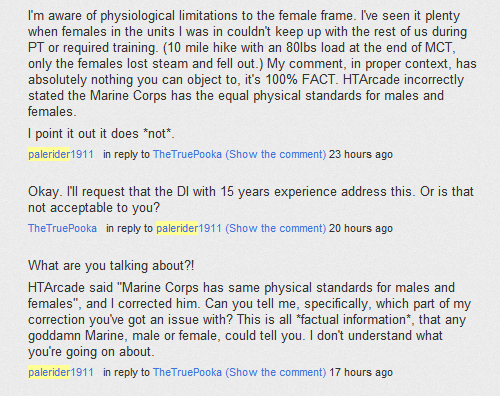 Ok, random question: Has "The True Pooka" always been such a retard, or am I being the retard here? I saw one of the people I'm subscribed to leave a comment with incorrect information about Marine Corps physical requirements for males and females, so I chimed in to correct him, prefacing it with "I'm a veteran Marine." Anyways, the following ensued: