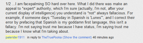 I'm not feeling masochistic enough to go see if he's replied some more at the moment. Anyways, rip away! Aside from my appeal to authority (which I will argue is not fallacious), what exactly am I stating that is so fucking disagreeable? The standards I stated are factual, it's not esoteric knowledge, and you don't need to be some cunt whose spent the last decade and a half in service to know this.
