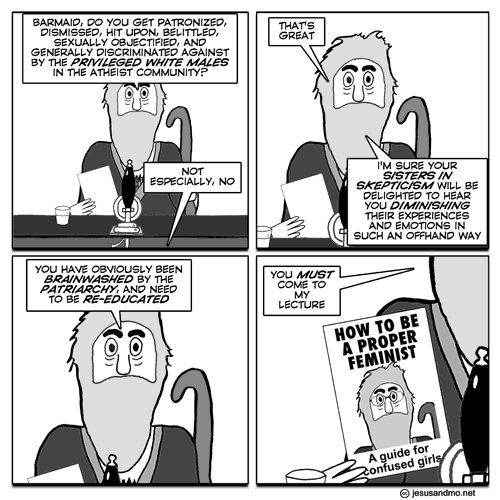 The closest I could think of is the recent cartoon by Jesus and Mo (Hi Author ;) ) where he pokes fun at Justin Vacula's line about needlework being a girl thing.[/spoiler]