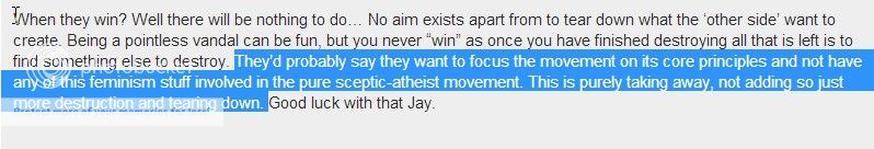 Oh please. FTB and their associates don't give a flying fuck about atheism anymore. And since the banner is one you are so intimately involved with, even the raging misogyny won't get them to peck at their keyboards. If anything, they'll be chuckling with glee over what they will tout as another victory against the hated Justin Fucking Vacula.FTB should 'jump on this' - perhaps in a matter of unexpected solidarity. The olive branch is here...and these are quite 'exemplary' examples of misogynistic thought I must say! So far, though, prior to this post, there has been an FTB blackout as it seems... I would expect at least a post from PZ in support because he loves this type of 'confrontationalist' activism regardless of what he thinks of me. Oh well. I'm not holding my breath.